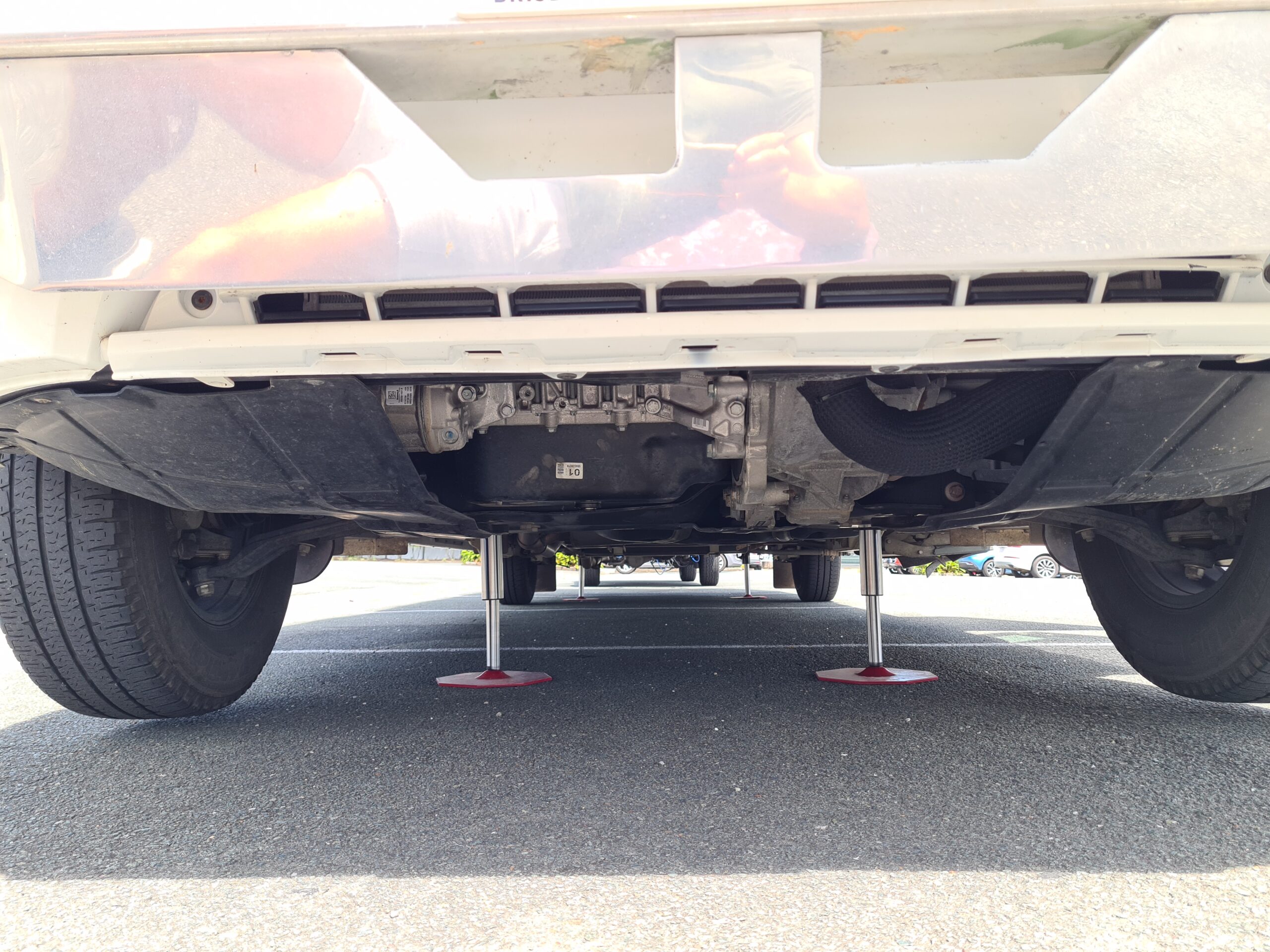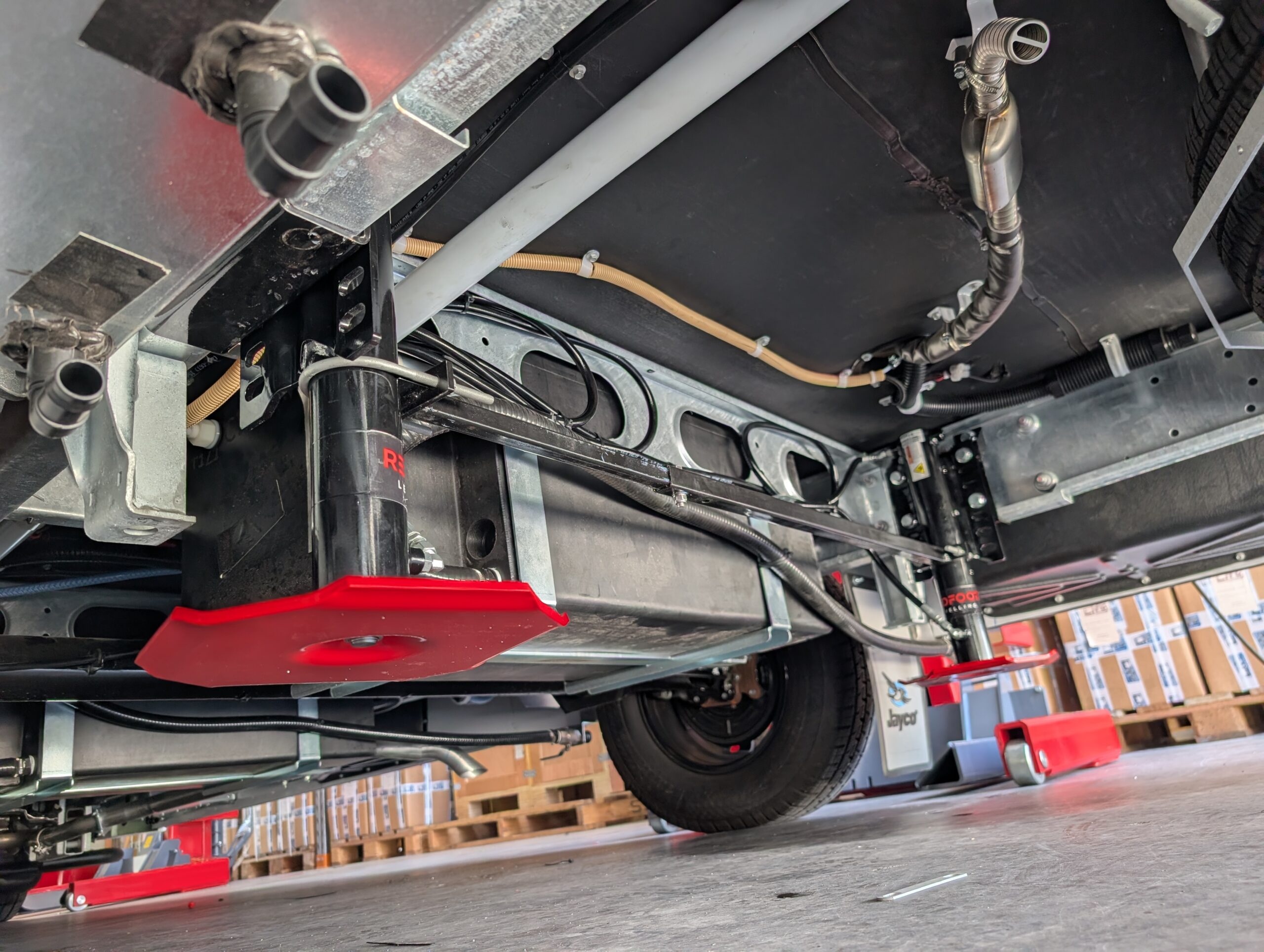An axle position UNDER the Chassis means the rear axle sits under the chassis rail leading to an increased height from the ground to the bottom of the chassis rail. This vehicle is considered ‘HIGH’ and Redfoot Levelling are able to use a single stage 13″ hydraulic cylinder on the rear of the vehicle that is less expensive.