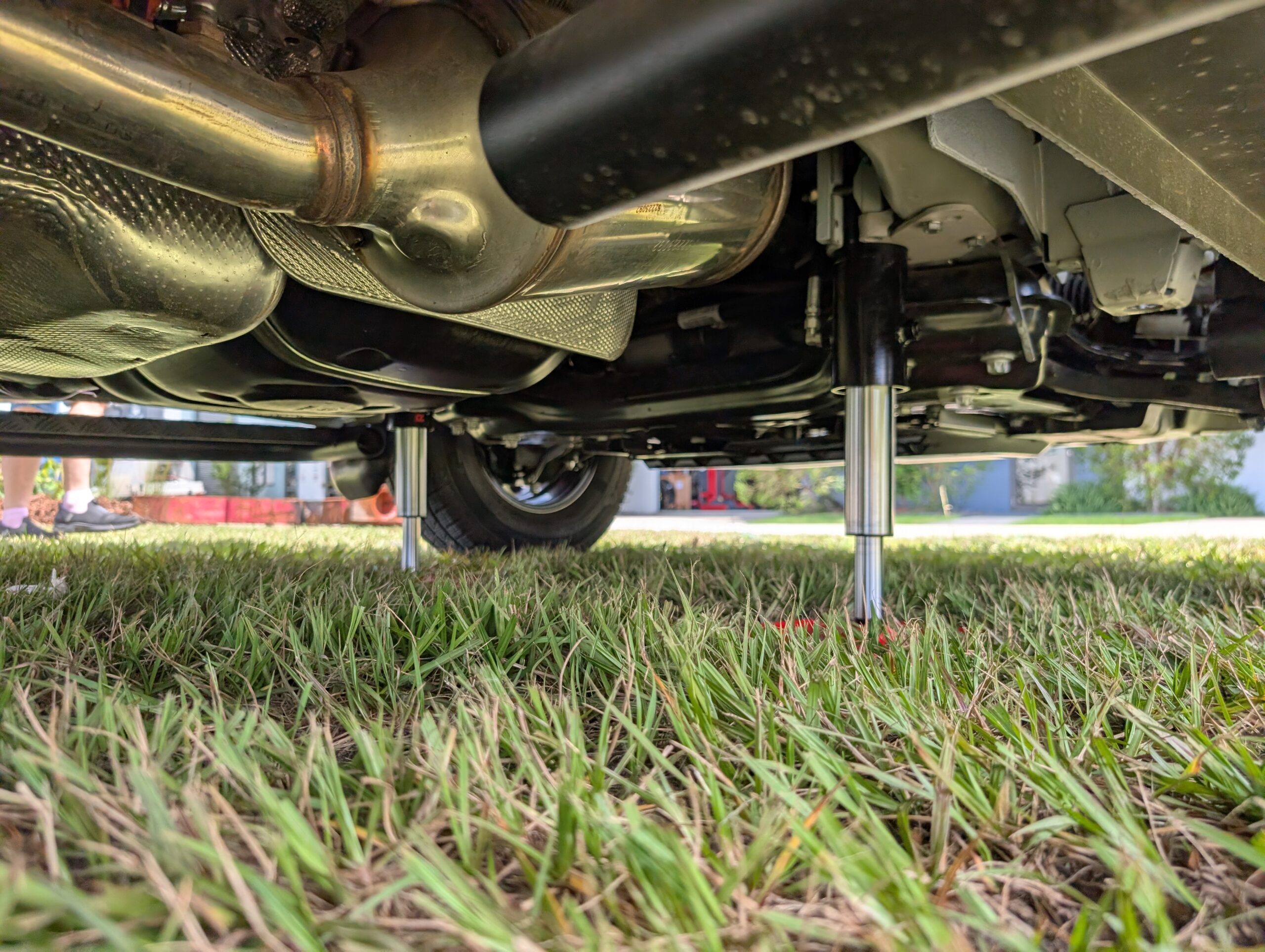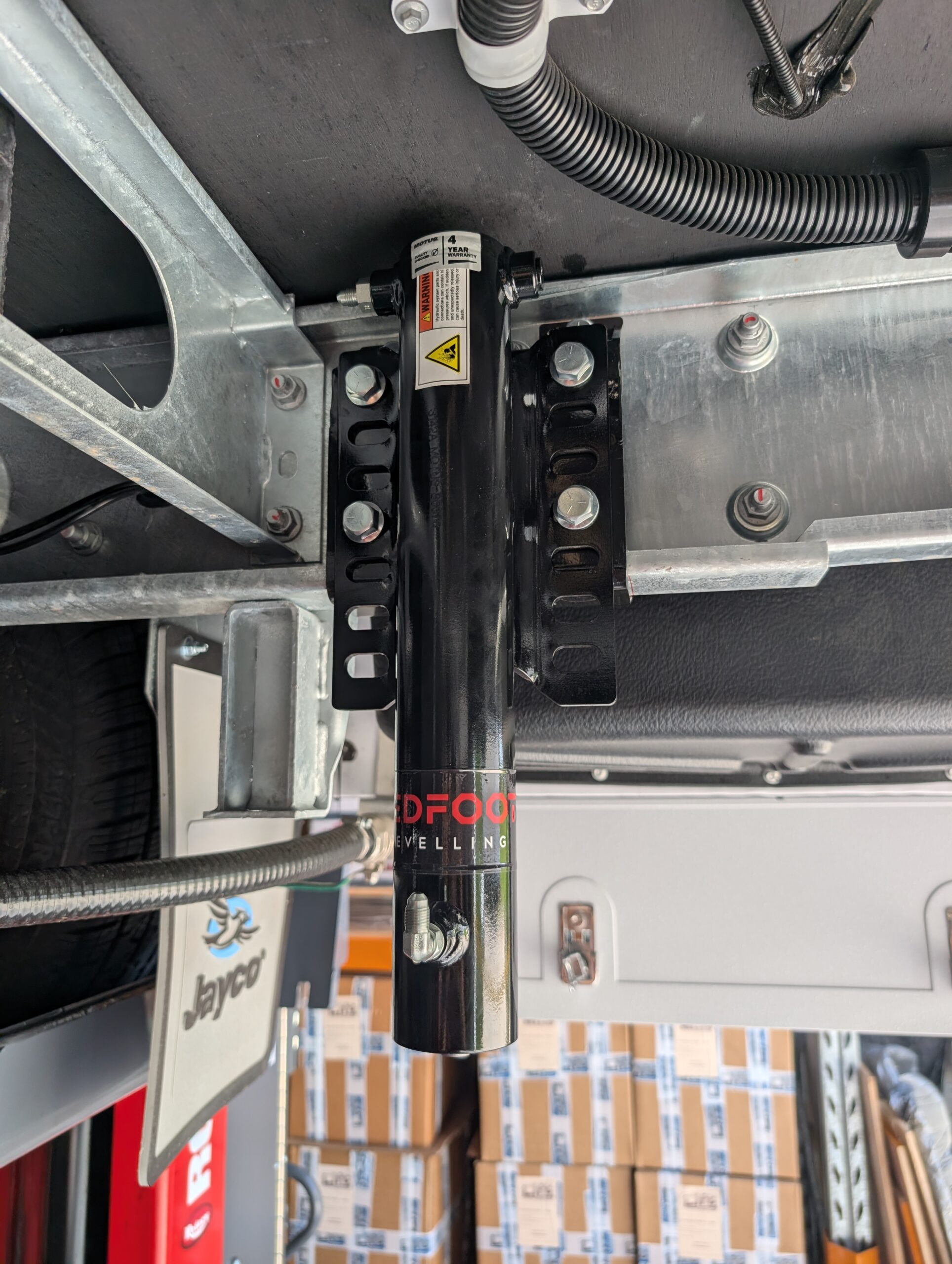 An axle position THROUGH the chassis (where the rear axle actually protrudes through the chassis) reduces the height from the ground to the bottom of the chassis rail, making the vehicle to sit lower to the ground. This vehicle is considered ‘LOW’ and Redfoot Levelling use a pair of two stage ‘Telescopic” hydraulic cylinders on the rear. It is a great solution but are more expensive.
