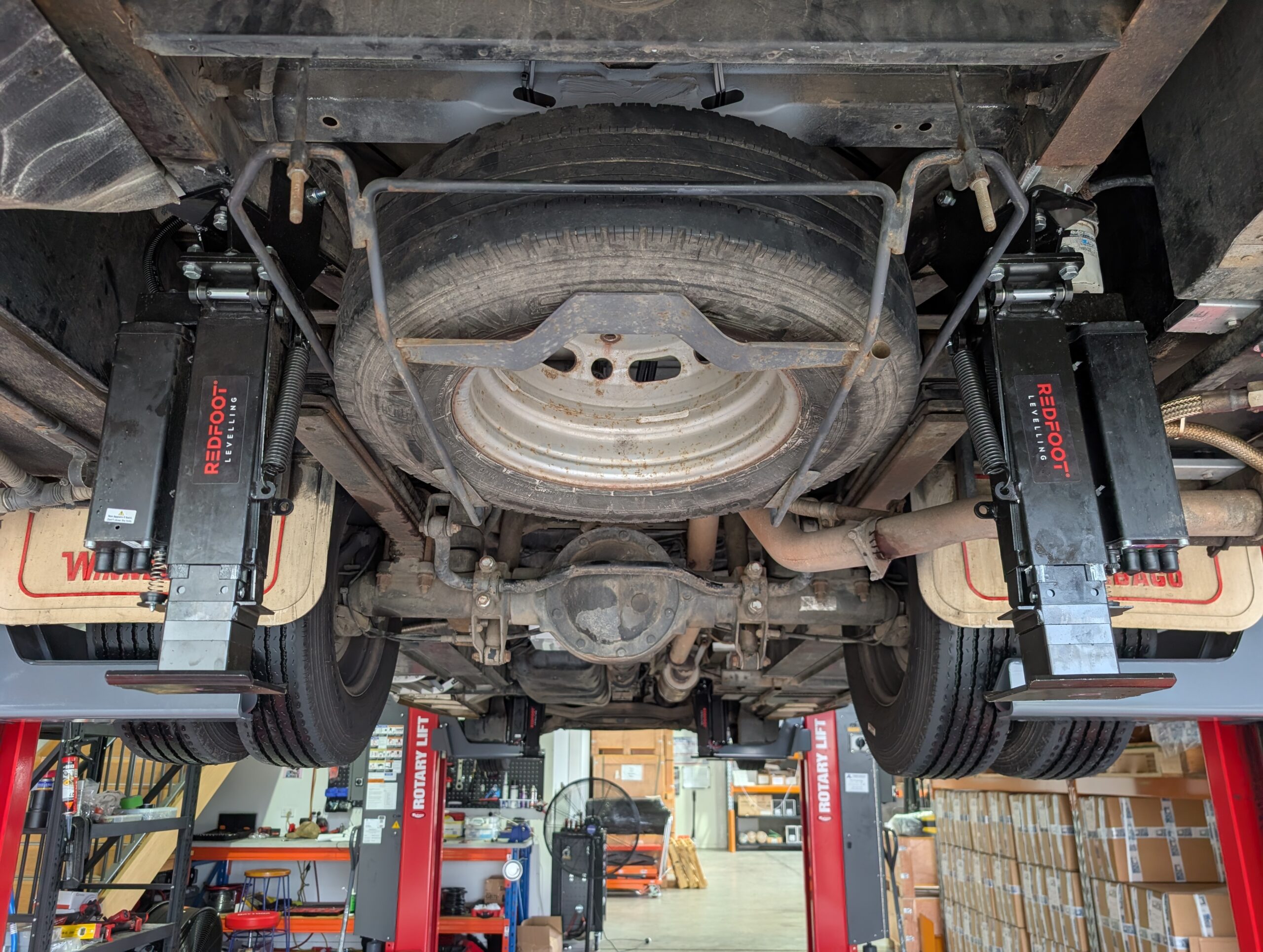 Step 3. Once clearance is achieved, check for any existing obstructions directly behind the rear axle that may impeded the jack placement. E.g. Storage bins, water tanks, exhaust or spare tyre. If you are concerned on this contact Redfoot Levelling directly to qualify your concerns prior to placing your order.