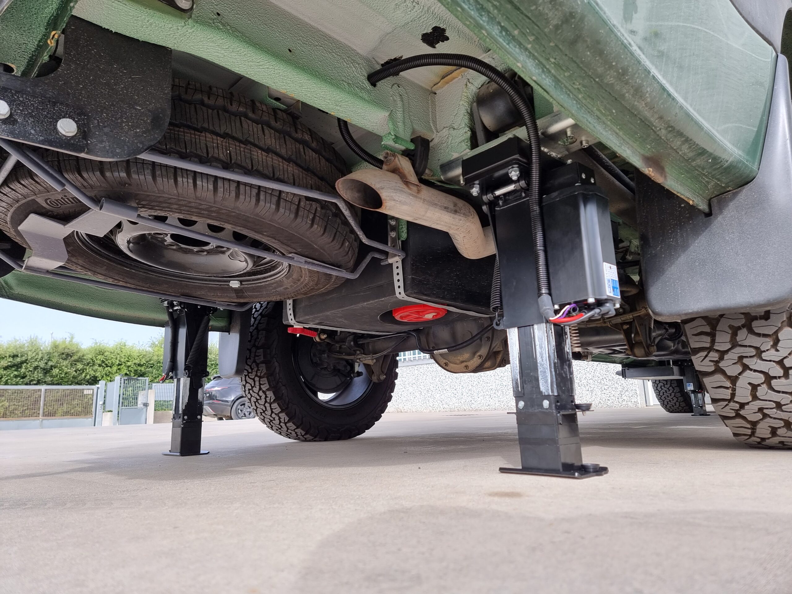 To qualify if your vehicle is suitable, you will need know if you have enough under chassis to ground clearance. The minimum under chassis to ground clearance required is 340mm, if this is not achieved then the vehicle will require a suspension upgrade. Don’t be too concerned as this can be also accommodated prior to installation of the AutoLift system for a small fee. Once you have measured your clearance of more than 340mm, the next step is to look for any obstruction between the chassis rail, directly behind the rear axle. If there is a spare tyre or water tank impeding the location of the rear jacks then the Redfoot AutoLift system will require the individual bracket option for your installation.