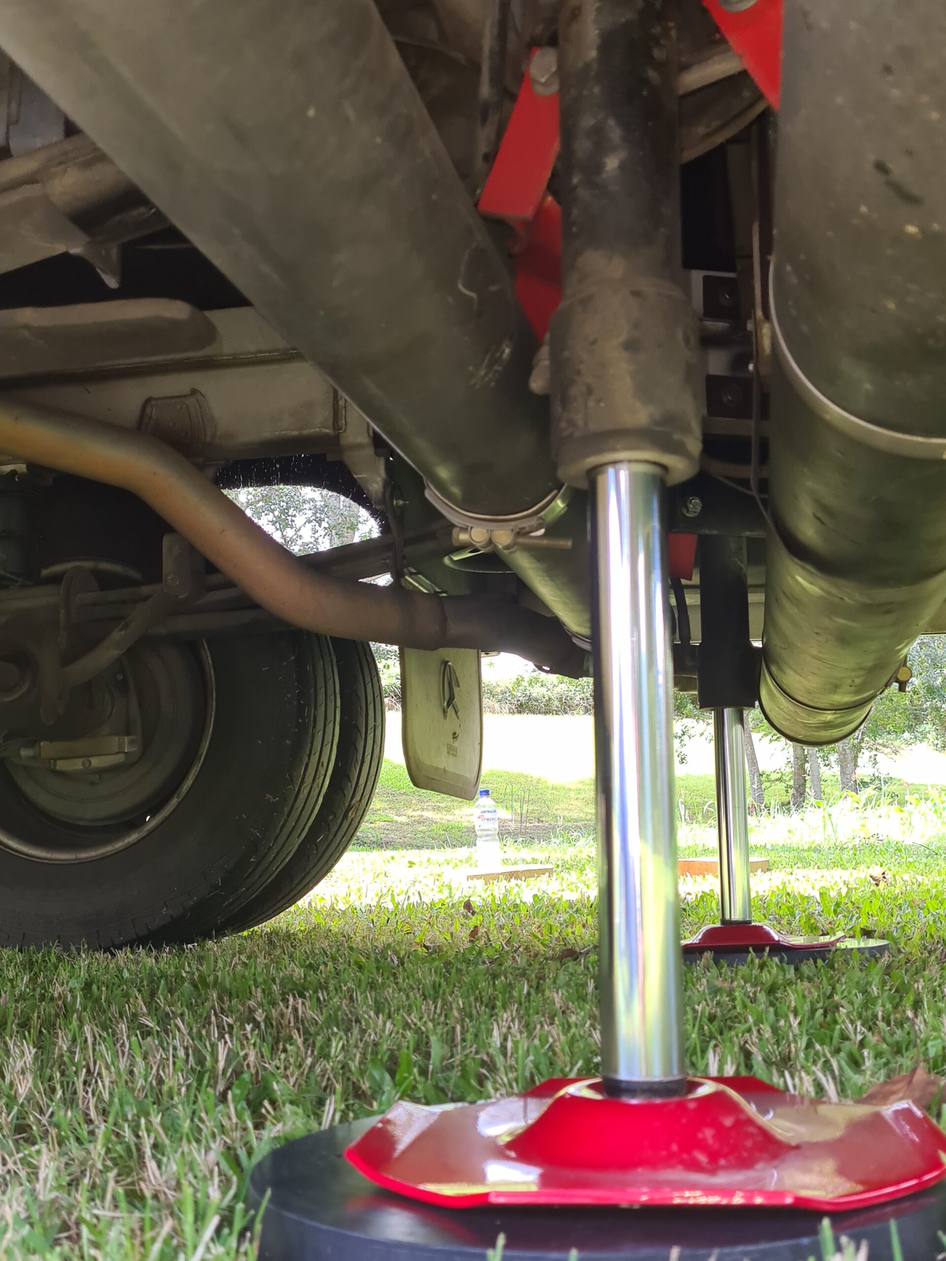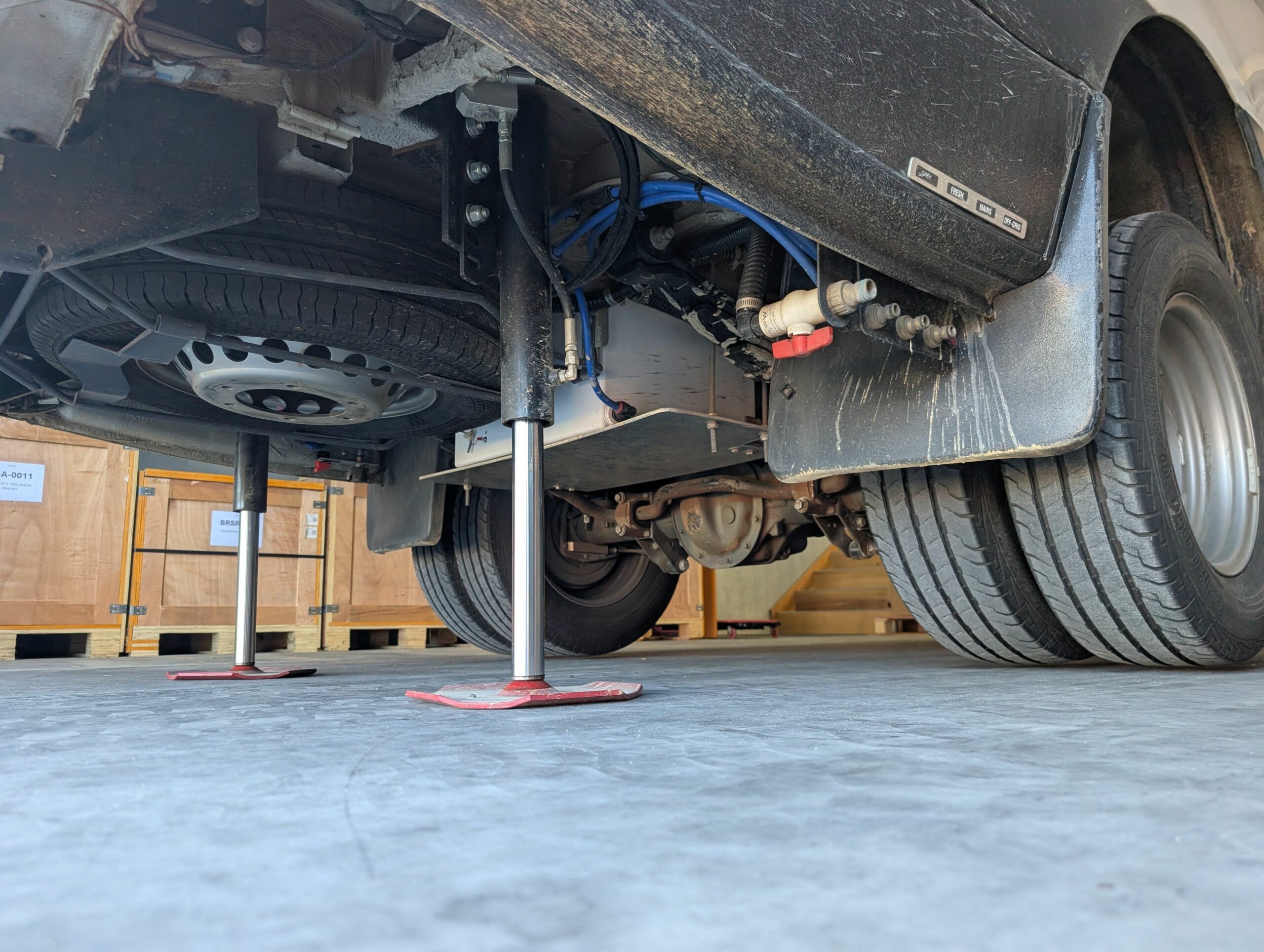 3. Four custom-designed hydraulic cylinders that match the wedge shape of the Sprinter Chassis where the front sits lower to the ground than the rear